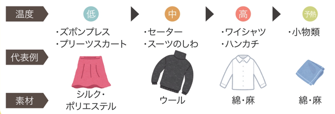 衣類の素材によりアイロンの適温は違います。低温の素材からアイロンがけを始め、低温から高温へ順番にかけるのが基本です!少量のハンカチなどはアイロンがけ終了後の余熱を利用してかけることもできますよ♪